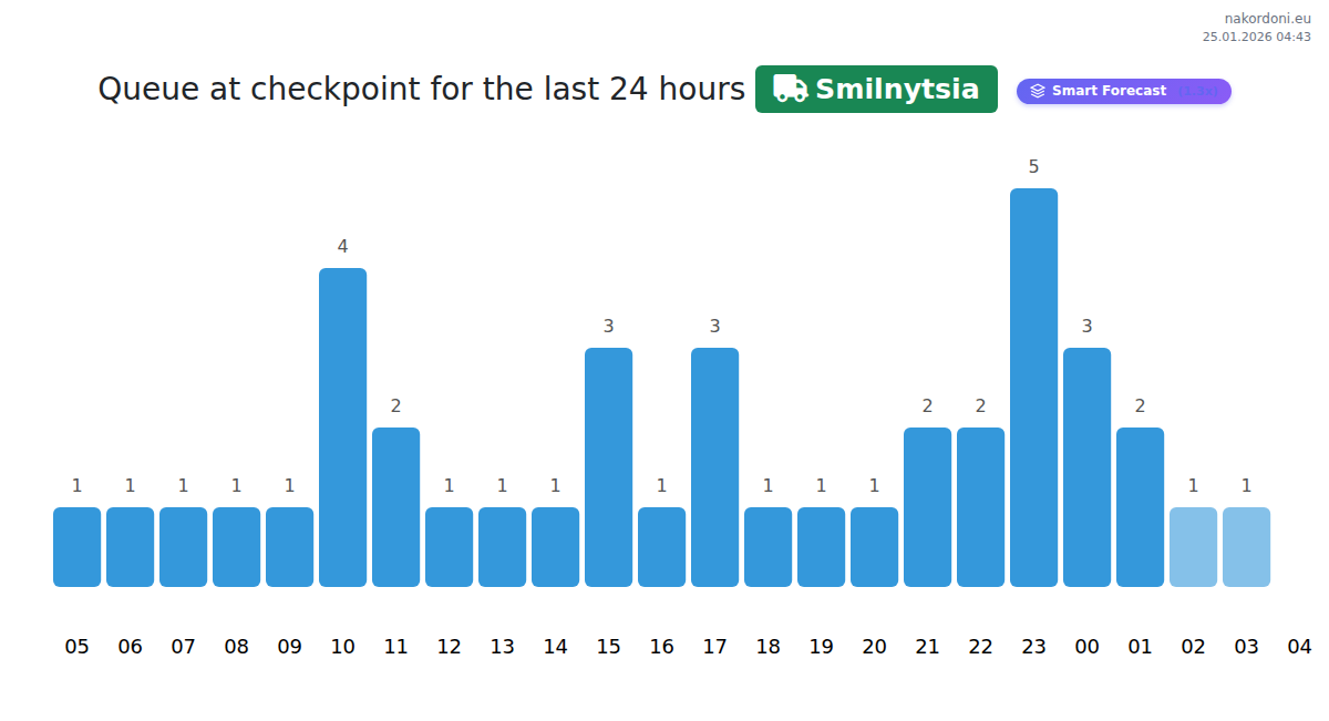To avoid long queues at the Smilnytsia - cargo transport (up to 7.5 tons) checkpoint, it is recommended to plan your border crossing during the least busy hours. According to the data from the past day, the lowest number of vehicles was observed between 1:00 and 4:00 hours. This is the ideal time to cross the border, saving time and avoiding delays.