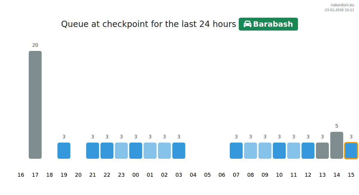 To avoid long queues at the Barabash - passenger car checkpoint, it is recommended to plan your border crossing during the least busy hours. According to the data from the past day, the lowest number of vehicles was observed between :00 and 3:00 hours. This is the ideal time to cross the border, saving time and avoiding delays.