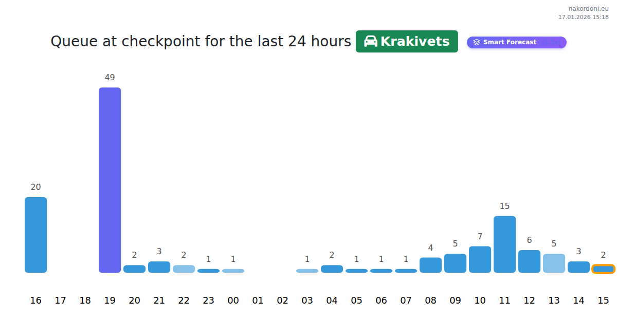 At Krakivets, wait times range from 15 to 211 minutes. Peak congestion occurs at 17:00, 18:00, and 19:00, so avoid these hours. The best times for a quick crossing are 05:00, 01:00, or 02:00.