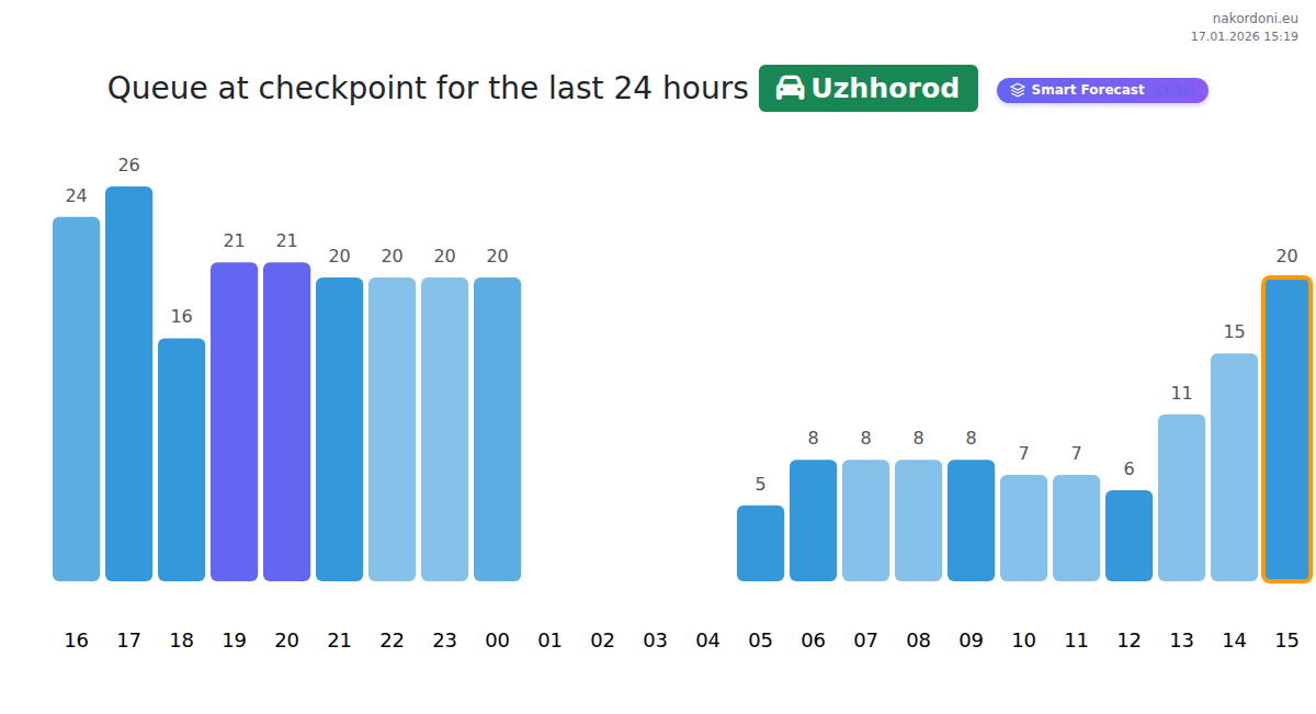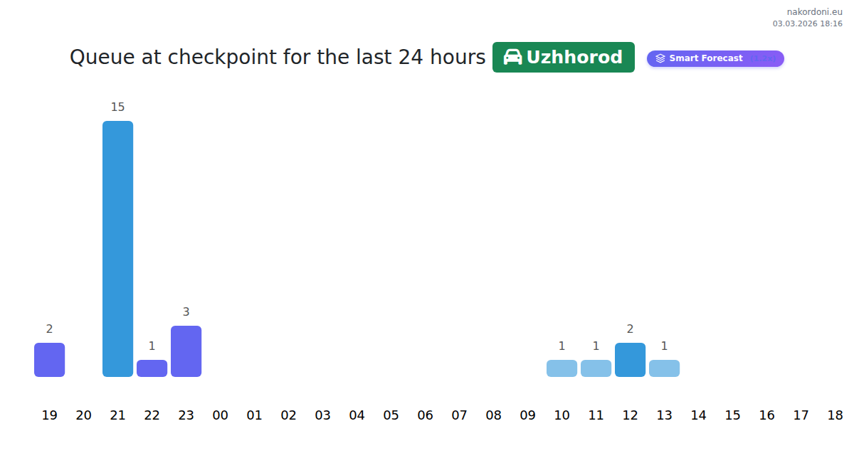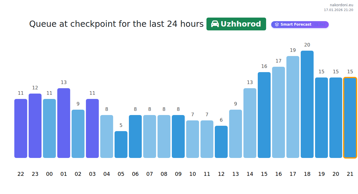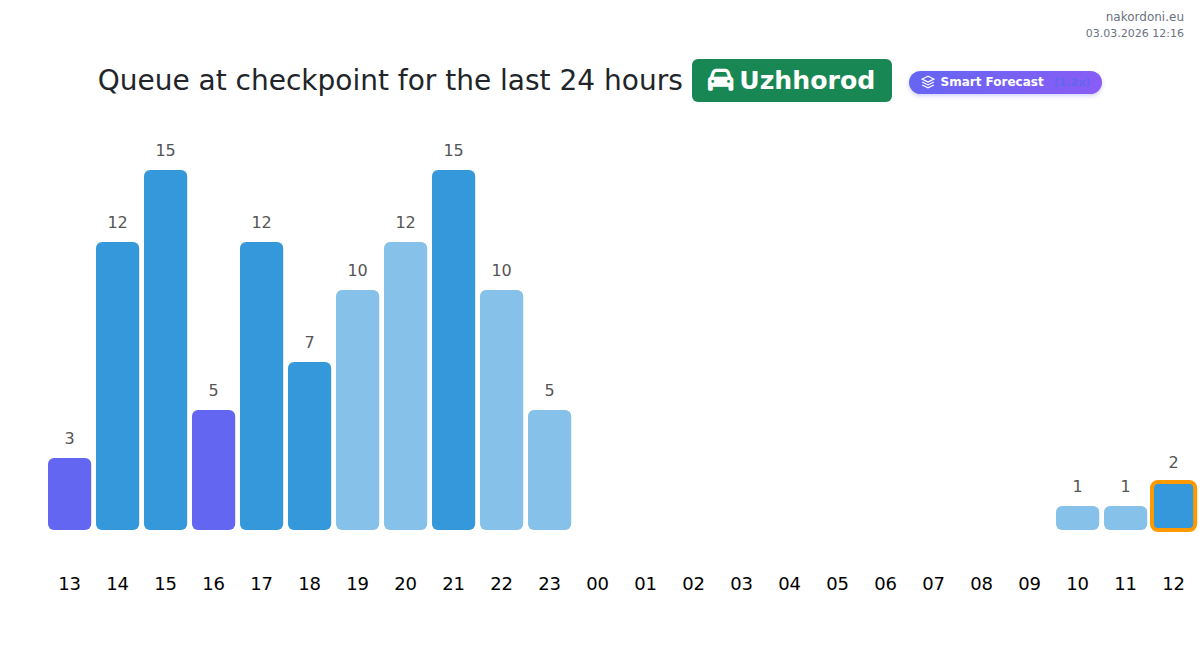 Plan your trips in advance using up-to-date border queue information at the Uzhhorod - passenger car checkpoint to make your crossing fast and convenient. Pay special attention to these hours to avoid peak times and reduce waiting times.
