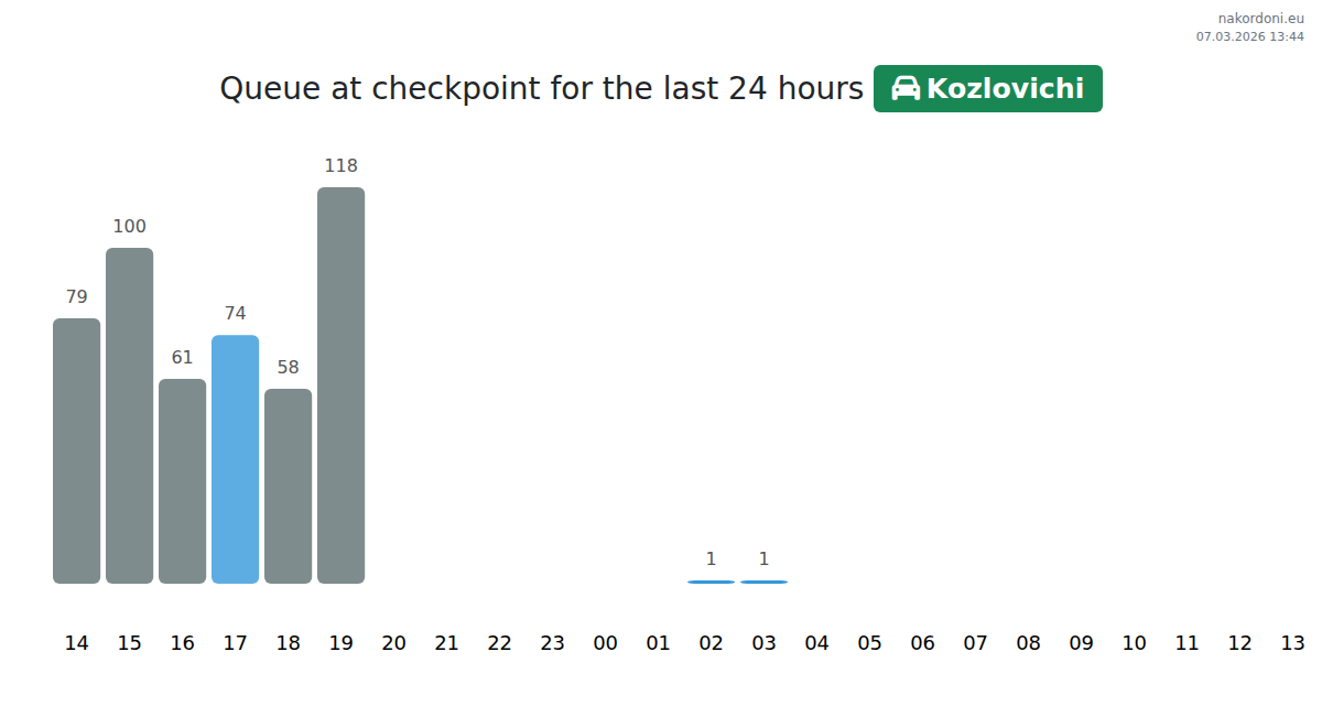 Wait times at Kozlovichi for passenger cars range from 95 to 625 min. Peak congestion is expected at 20:00, 13:00, and 14:00. For the shortest queues, plan your crossing around 04:00, 02:00, or 03:00.