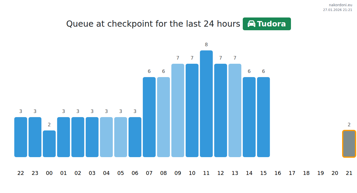 At Tudora, wait times for passenger cars range from 25 to 275 minutes. Avoid peak hours like 12:00, 11:00, and 15:00. The best times to cross are 19:00, 20:00, and 21:00.