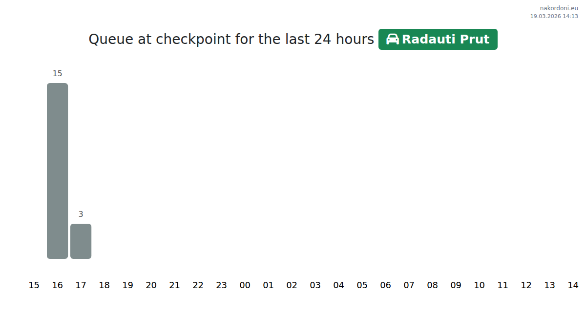 At Radauti Prut until end of tomorrow, expected queue is 15–215 minutes for passenger cars. Peak hours: 15:00, 14:00, 10:00. Shortest queues expected at 21:00, 22:00, 23:00. Tonight and tomorrow morning traffic will be moderate.