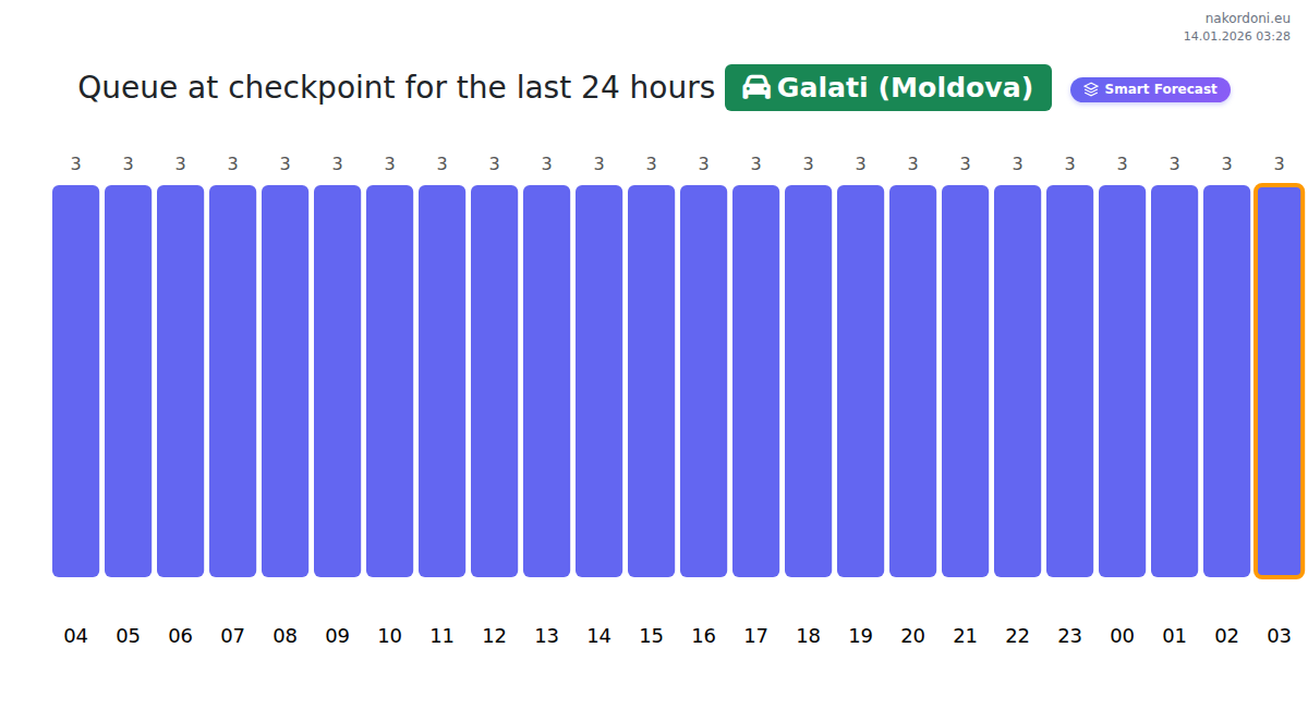 At Galati (Moldova), wait times range from 15 to 10015 minutes. Avoid peak hours at 13:00, 14:00, 15:00. The best crossing times are from 17:00 to 19:00 for shorter queues.