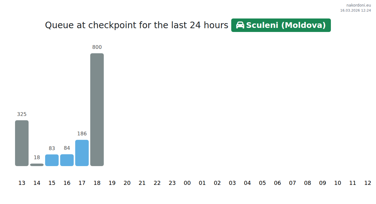 At Sculeni (Moldova), wait times for passenger cars range from 15 to 50015 minutes. Avoid peak congestion at 11:00, 16:00, and 08:00 to save time. The best hours for a faster crossing are 15:00, 17:00, and 18:00.