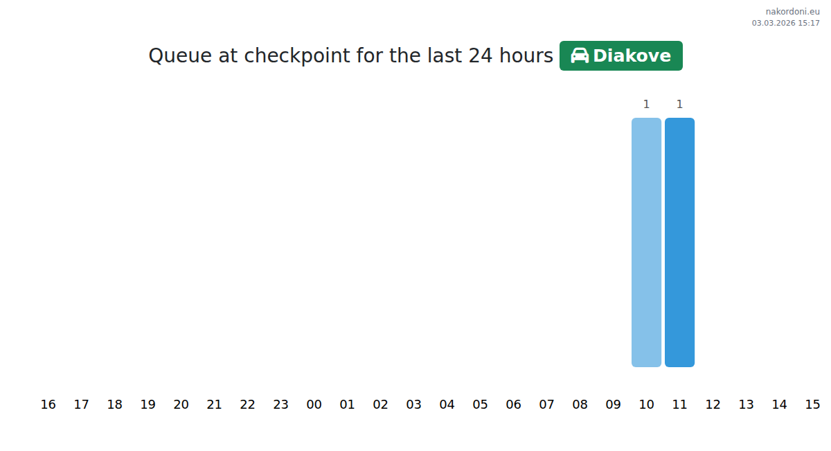 At Diakove, car wait times range from 15 to 51 minutes. Avoid peak congestion at 08:00, 11:00, and 13:00. For the shortest queues, plan your crossing around 09:00, 10:00, or 12:00.
