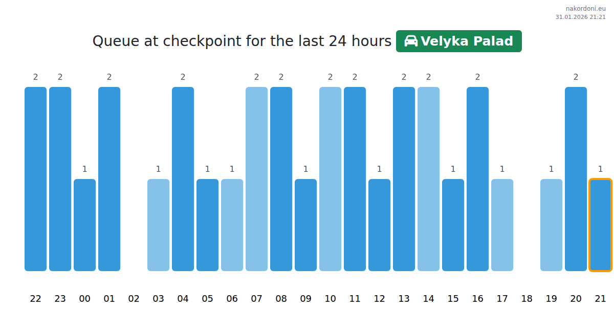 Plan your trips in advance using up-to-date border queue information at the Velyka Palad - passenger car checkpoint to make your crossing fast and convenient. Pay special attention to these hours to avoid peak times and reduce waiting times.
