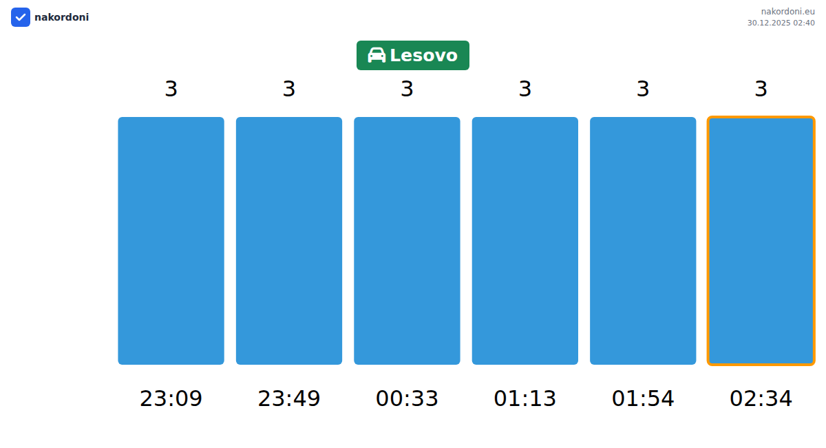 Plan your trips in advance using up-to-date border queue information at the Lesovo - passenger car checkpoint to make your crossing fast and convenient. Pay special attention to these hours to avoid peak times and reduce waiting times.