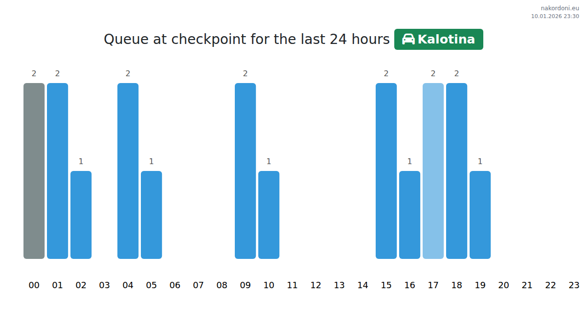 To avoid long queues at the Kalotina - passenger car checkpoint, it is recommended to plan your border crossing during the least busy hours. According to the data from the past day, the lowest number of vehicles was observed between :00 and 1:00 hours. This is the ideal time to cross the border, saving time and avoiding delays.