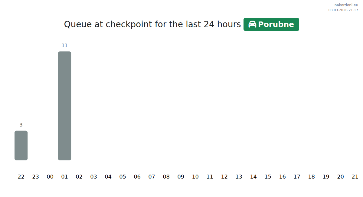 Wait times at Porubne for passenger cars range from 15 to 357 minutes. To minimize delays, avoid peak hours at 08:00, 17:00, and 03:00. For the shortest queues, we recommend crossing during the best times: 00:00, 01:00, or 02:00.