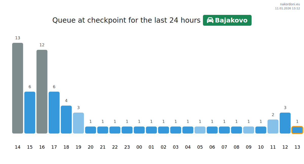 At Bajakovo, wait times for passenger cars range from 55 to 215 minutes today. Peak traffic is expected at 14:00, 13:00, and 10:00, so avoiding these hours is recommended. For the fastest crossing, aim for 01:00, 04:00, or 05:00.