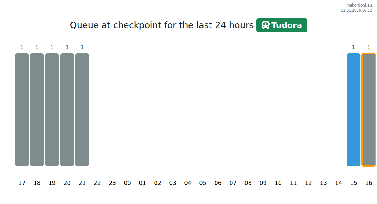 The estimated wait time for buses at the Tudora checkpoint is 15-15 minutes. Peak congestion is expected between 21:00 and 23:00, so it is better to avoid these hours. For the shortest queues, plan your crossing at 00:00, 01:00, or 02:00.