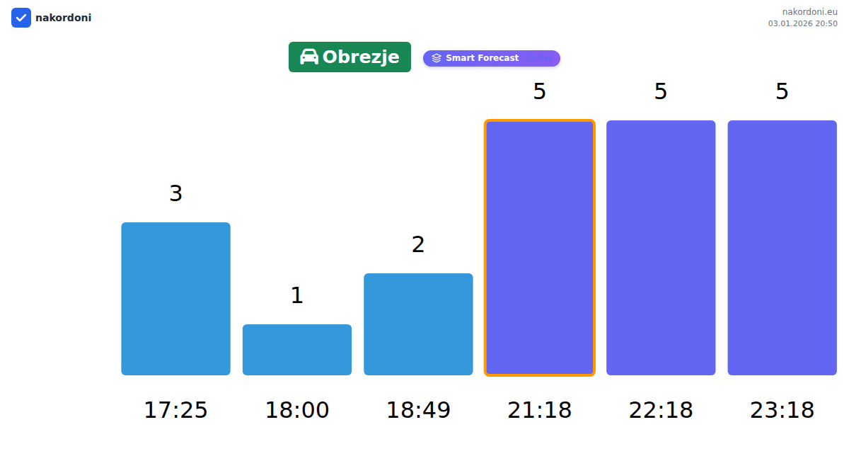 Plan your trips in advance using up-to-date border queue information at the Obrezje - passenger car checkpoint to make your crossing fast and convenient. Pay special attention to these hours to avoid peak times and reduce waiting times.
