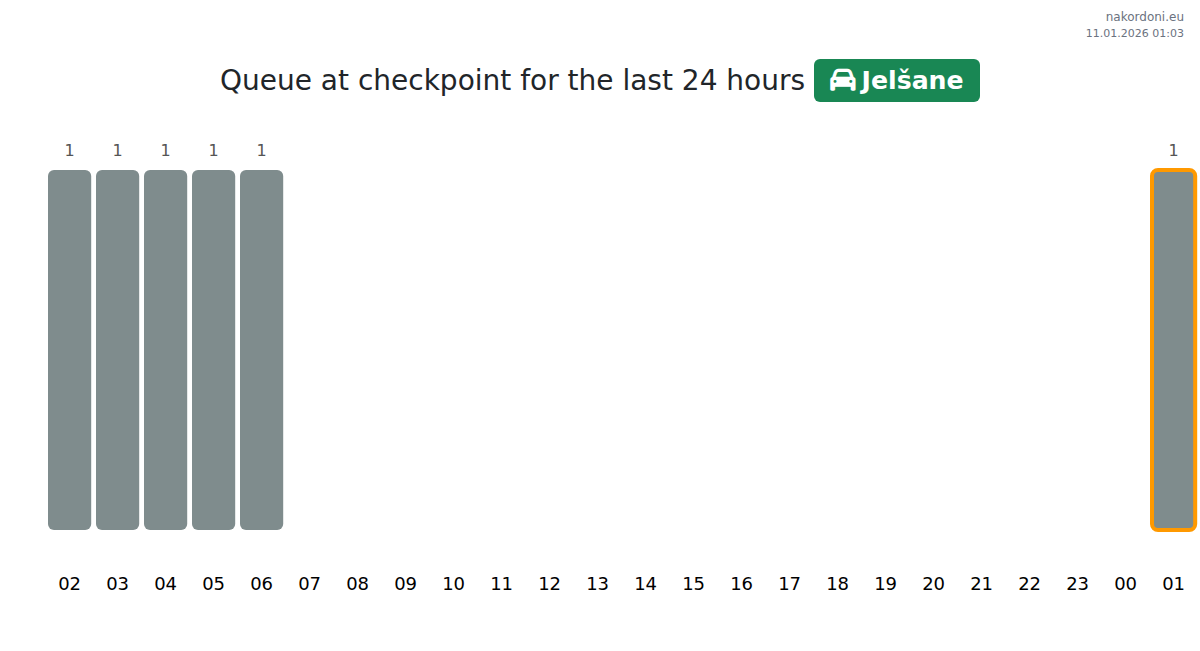 At the Jelšane checkpoint, the wait time is stable at 71 minutes. Peak hours are expected at 21:00, 22:00, and 23:00, which are best to avoid. The ideal time for crossing is between 00:00 and 02:00.