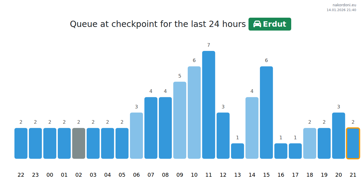 To avoid long queues at the Erdut - passenger car checkpoint, it is recommended to plan your border crossing during the least busy hours. According to the data from the past day, the lowest number of vehicles was observed between :00 and 1:00 hours. This is the ideal time to cross the border, saving time and avoiding delays.