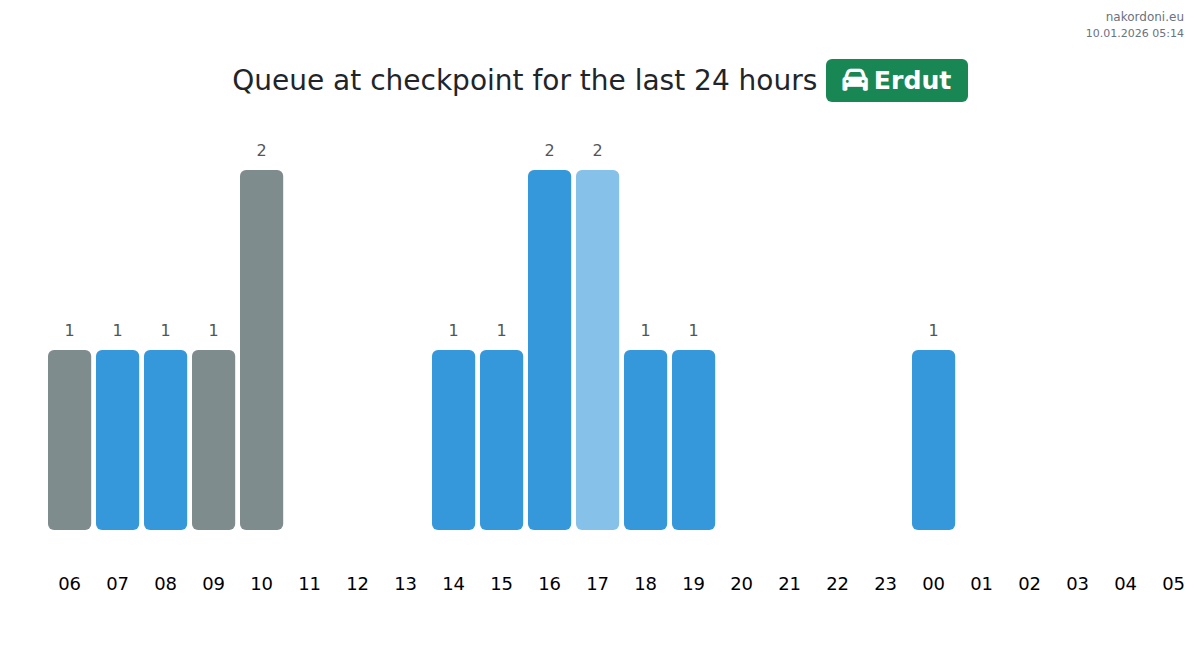 At the Erdut checkpoint, passenger cars currently face a wait time of 71-77 minutes. It is best to avoid peak hours at 03:00, 19:00, and 00:00, while the most favorable times for crossing are 02:00, 04:00, and 05:00.