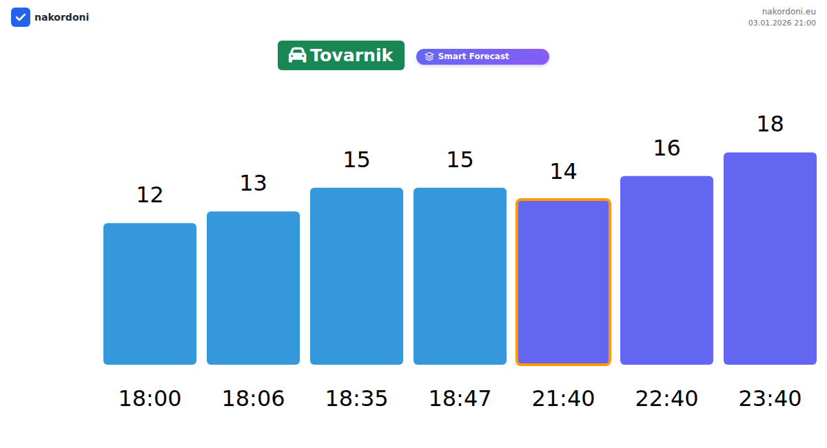 Plan your trips in advance using up-to-date border queue information at the Tovarnik - passenger car checkpoint to make your crossing fast and convenient. Pay special attention to these hours to avoid peak times and reduce waiting times.