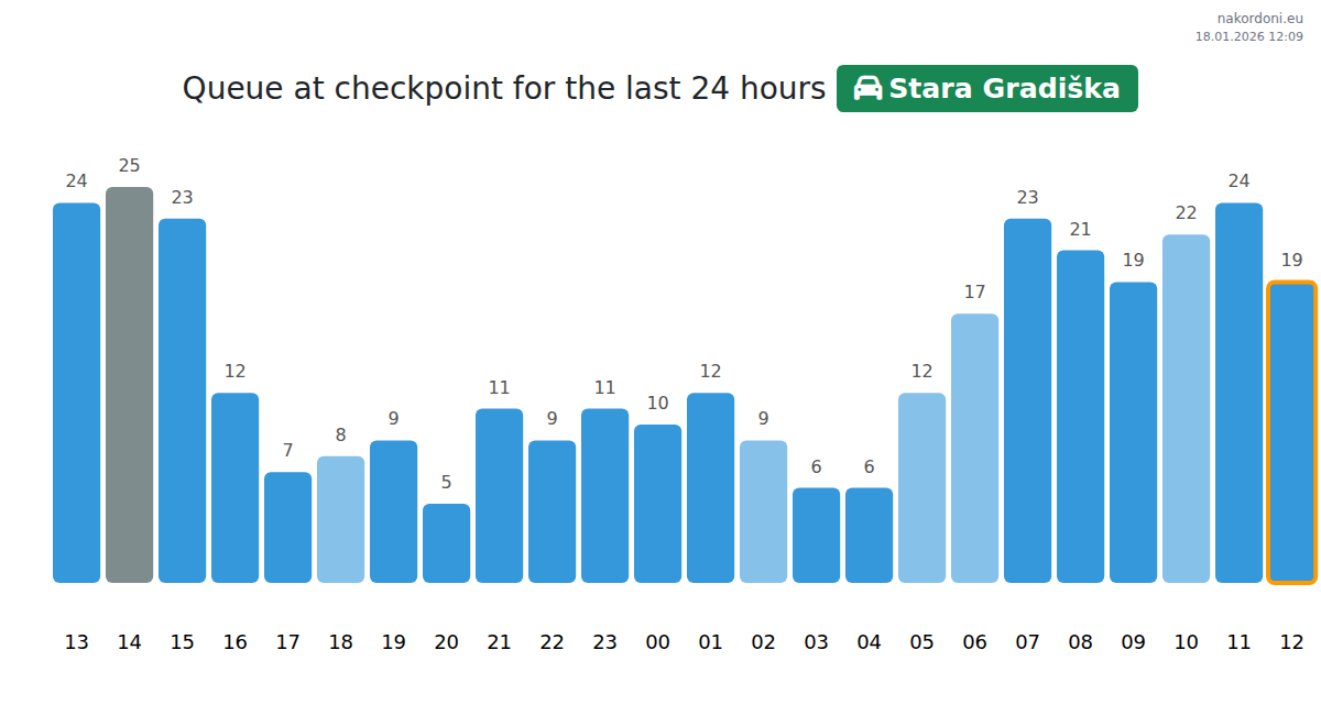 To avoid long queues at the Stara Gradiška - passenger car checkpoint, it is recommended to plan your border crossing during the least busy hours. According to the data from the past day, the lowest number of vehicles was observed between 21:00 and 22:00 hours. This is the ideal time to cross the border, saving time and avoiding delays.