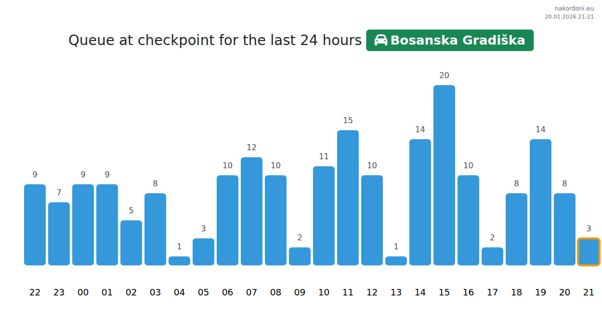 At the Bosanska Gradiška checkpoint, wait times for cars range from 119 to 209 minutes. Peak hours to avoid are 10:00, 14:00, and 09:00, while the best times for a quick crossing are 03:00, 01:00, and 02:00.