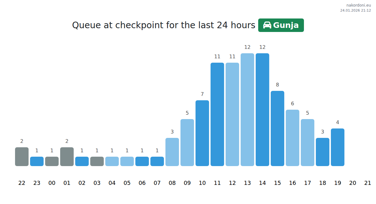 At the Gunja checkpoint, the estimated wait time for passenger cars ranges from 71 to 107 minutes. Peak congestion occurs between 11:00 and 13:00; for the shortest queues, we recommend crossing from 00:00 to 02:00.