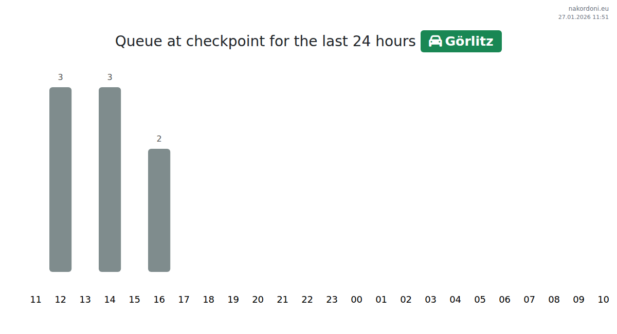 To avoid long queues at the Görlitz - passenger car TaxFREE (Red line) checkpoint, it is recommended to plan your border crossing during the least busy hours. According to the data from the past day, the lowest number of vehicles was observed between 15:00 and 19:00 hours. This is the ideal time to cross the border, saving time and avoiding delays.