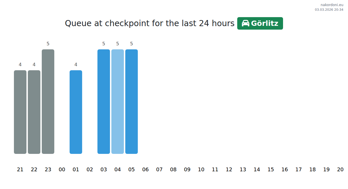 The expected wait time for passenger cars at the Görlitz checkpoint is 15-39 minutes. Peak traffic is predicted at 10:00, 14:00, and 22:00; for a faster crossing, choose 17:00, 19:00, or 23:00.