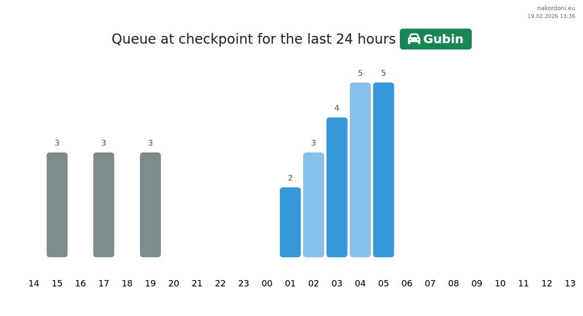 At Gubin until end of tomorrow, expected queue is 15–39 minutes for passenger cars. Peak hours: 18:00, 06:00, 08:00. Shortest queues expected at 23:00, 01:00, 03:00. Tonight and tomorrow morning traffic will be moderate.