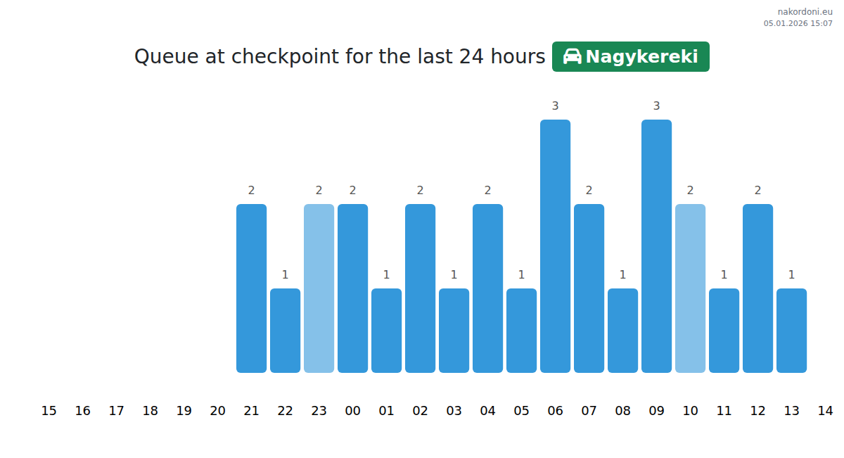 To avoid long queues at the Nagykereki - passenger car checkpoint, it is recommended to plan your border crossing during the least busy hours. According to the data from the past day, the lowest number of vehicles was observed between 2:00 and 4:00 hours. This is the ideal time to cross the border, saving time and avoiding delays.