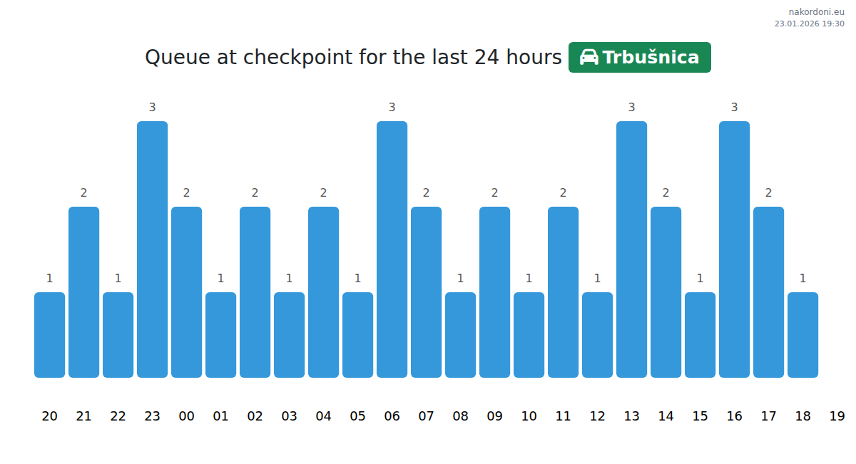 Plan your trips in advance using up-to-date border queue information at the Trbušnica - passenger car checkpoint to make your crossing fast and convenient. Pay special attention to these hours to avoid peak times and reduce waiting times.