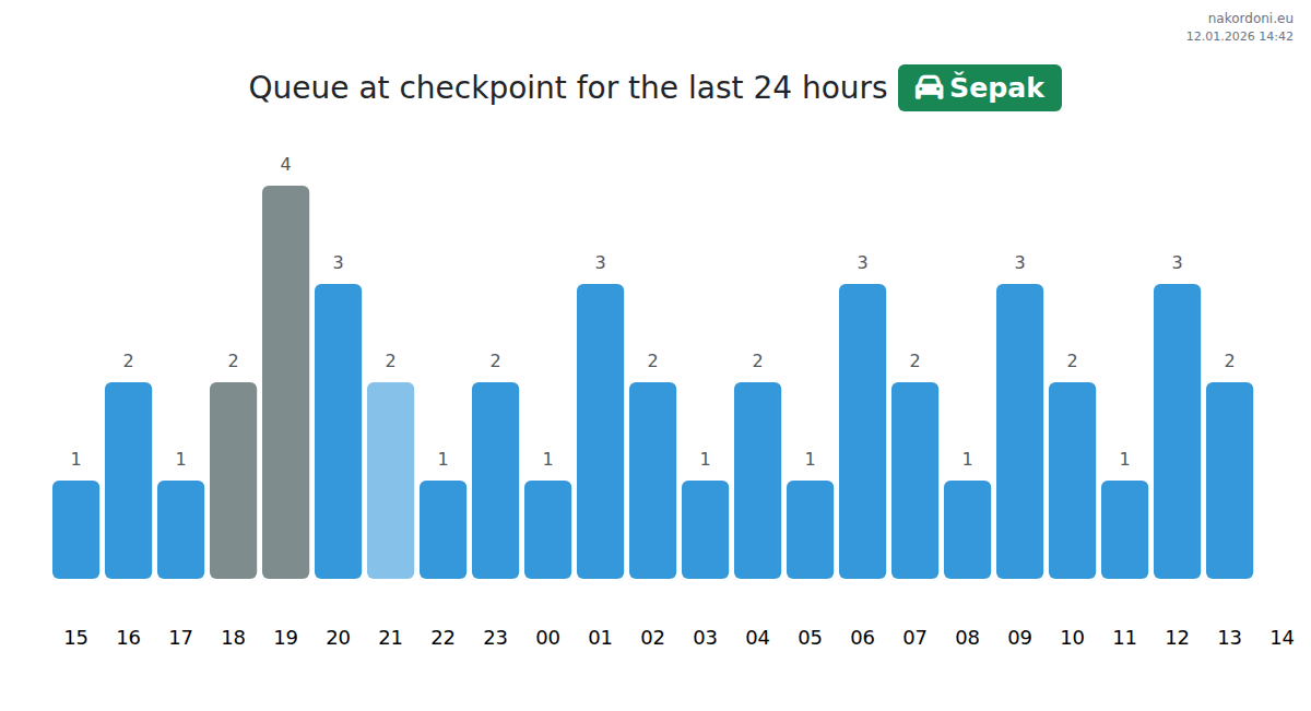 To avoid long queues at the Šepak - passenger car checkpoint, it is recommended to plan your border crossing during the least busy hours. According to the data from the past day, the lowest number of vehicles was observed between :00 and 2:00 hours. This is the ideal time to cross the border, saving time and avoiding delays.