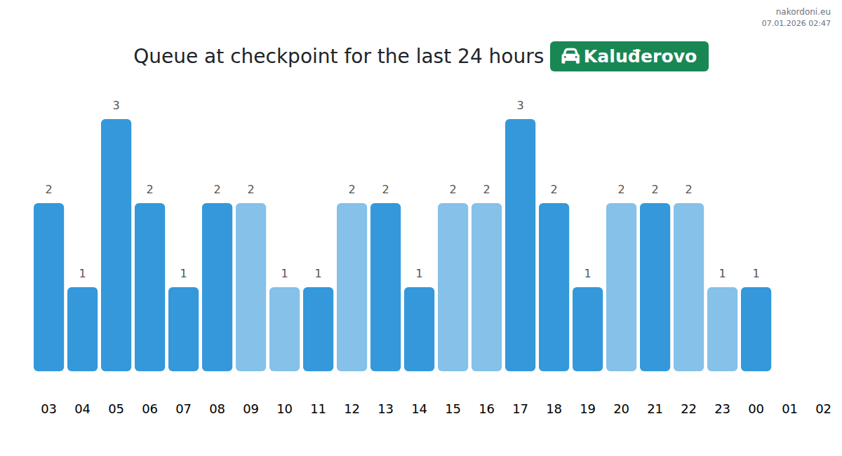 To avoid long queues at the Kaluđerovo - passenger car checkpoint, it is recommended to plan your border crossing during the least busy hours. According to the data from the past day, the lowest number of vehicles was observed between 2:00 and 4:00 hours. This is the ideal time to cross the border, saving time and avoiding delays.