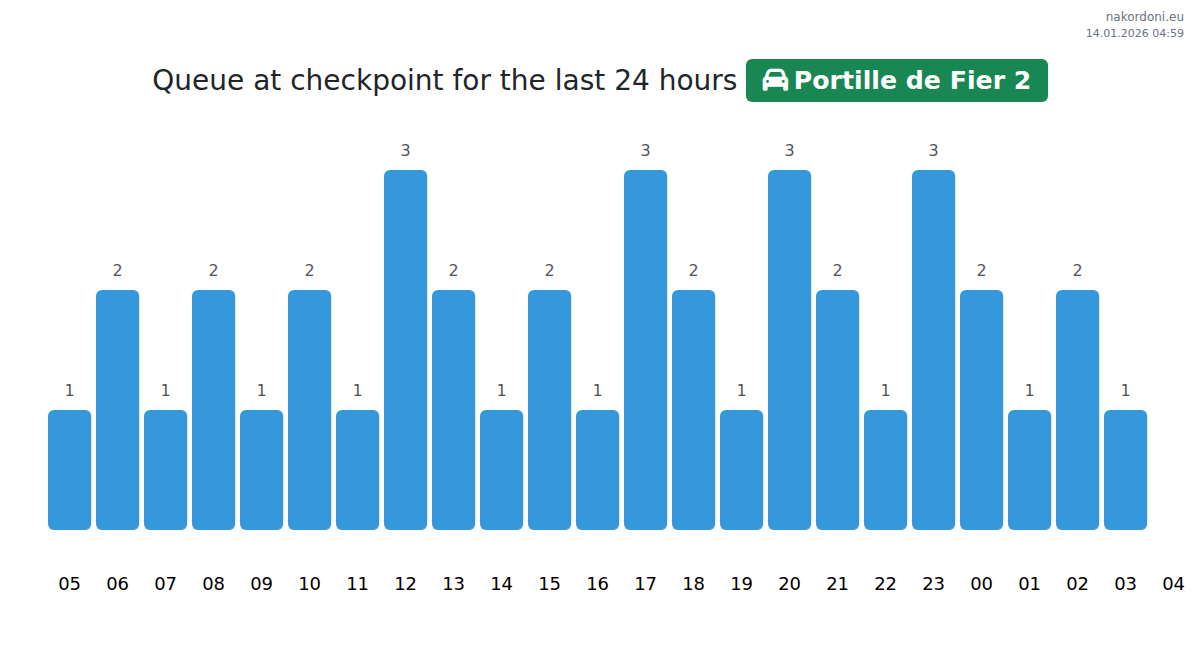 To avoid long queues at the Portille de Fier 2 - passenger car checkpoint, it is recommended to plan your border crossing during the least busy hours. According to the data from the past day, the lowest number of vehicles was observed between 2:00 and 4:00 hours. This is the ideal time to cross the border, saving time and avoiding delays.