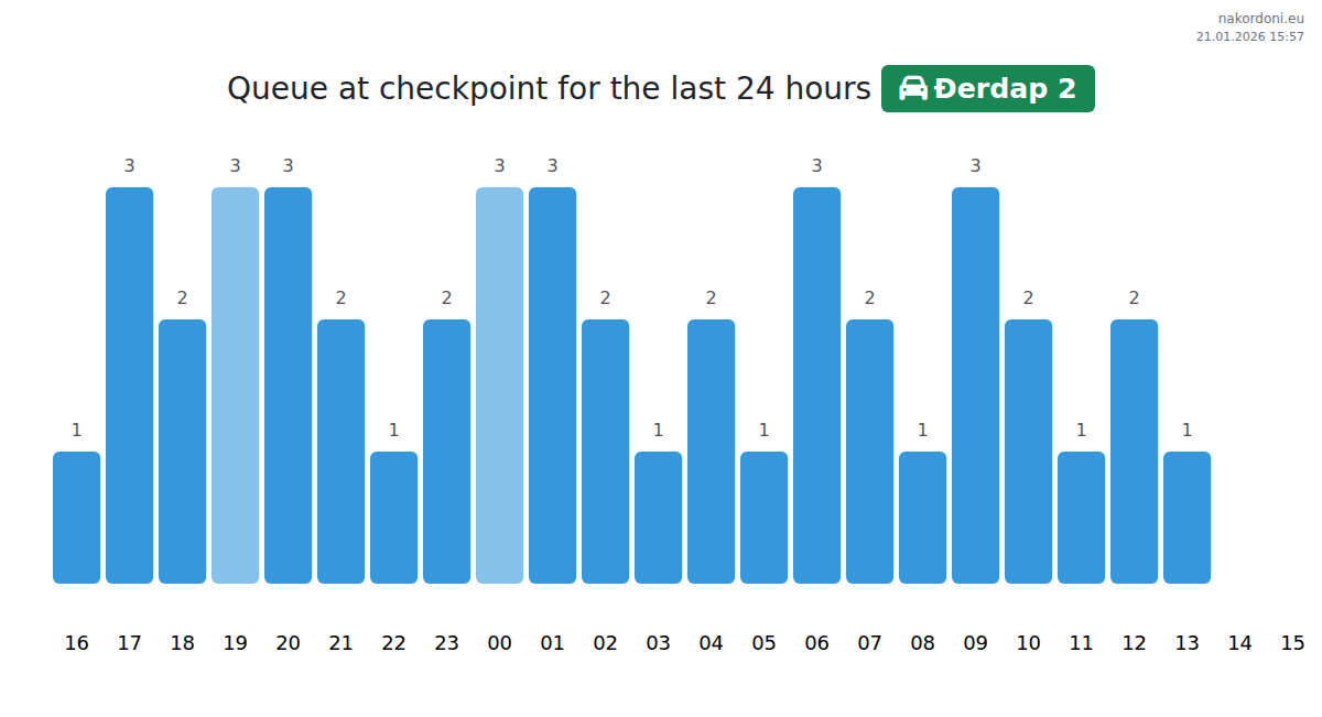To avoid long queues at the Đerdap 2 - passenger car checkpoint, it is recommended to plan your border crossing during the least busy hours. According to the data from the past day, the lowest number of vehicles was observed between :00 and 3:00 hours. This is the ideal time to cross the border, saving time and avoiding delays.