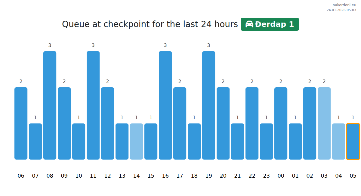 To avoid long queues at the Đerdap 1 - passenger car checkpoint, it is recommended to plan your border crossing during the least busy hours. According to the data from the past day, the lowest number of vehicles was observed between 1:00 and 4:00 hours. This is the ideal time to cross the border, saving time and avoiding delays.