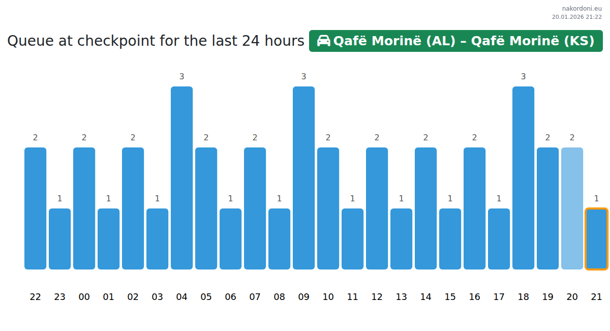 To avoid long queues at the Qafë Morinë (AL) – Qafë Morinë (KS) - passenger car checkpoint, it is recommended to plan your border crossing during the least busy hours. According to the data from the past day, the lowest number of vehicles was observed between :00 and 3:00 hours. This is the ideal time to cross the border, saving time and avoiding delays.
