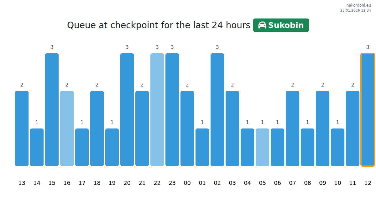 Plan your trips in advance using up-to-date border queue information at the Sukobin - passenger car checkpoint to make your crossing fast and convenient. Pay special attention to these hours to avoid peak times and reduce waiting times.