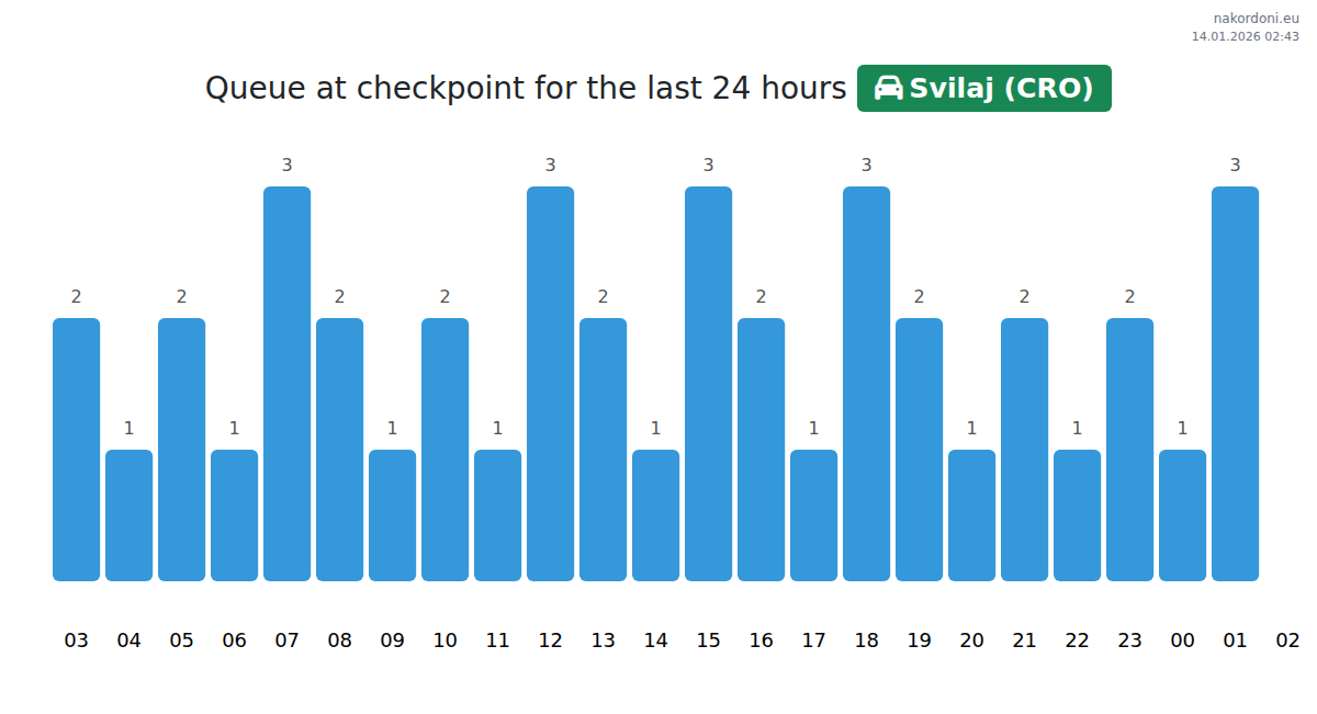 At the Svilaj (CRO) checkpoint, passenger cars can expect wait times between 20 and 50 minutes. Peak hours to avoid are 19:00, 11:00, and 15:00, while the best times for a quick crossing are 01:00, 02:00, and 03:00.