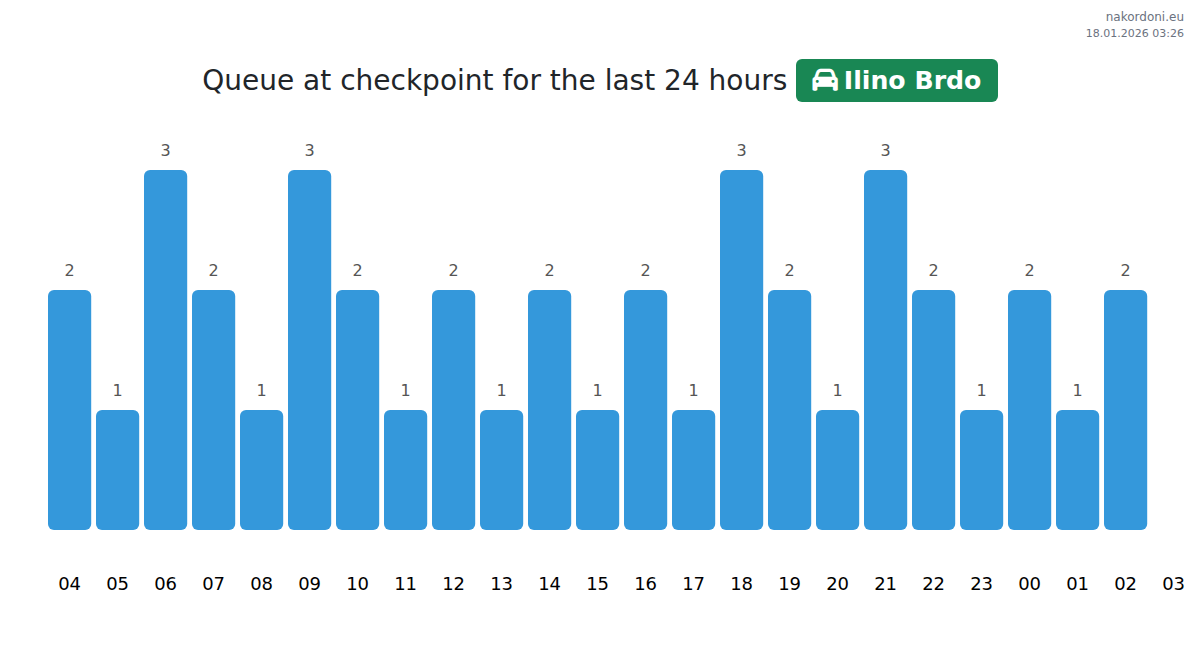 At the Ilino Brdo checkpoint, wait times for passenger cars range from 15 to 35 minutes. Avoid peak hours at 00:00, 10:00, and 13:00; the best times for a quick crossing are 01:00, 02:00, or 03:00.