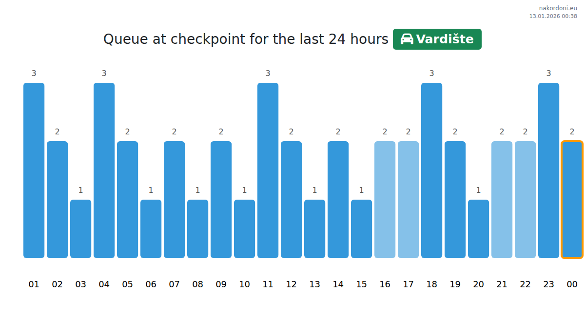 To avoid long queues at the Vardište - passenger car checkpoint, it is recommended to plan your border crossing during the least busy hours. According to the data from the past day, the lowest number of vehicles was observed between :00 and 2:00 hours. This is the ideal time to cross the border, saving time and avoiding delays.