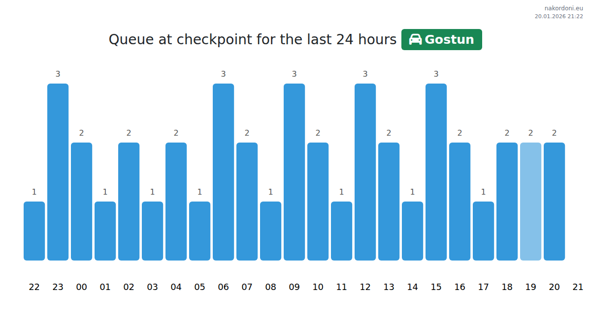 Plan your trips in advance using up-to-date border queue information at the Gostun - passenger car checkpoint to make your crossing fast and convenient. Pay special attention to these hours to avoid peak times and reduce waiting times.