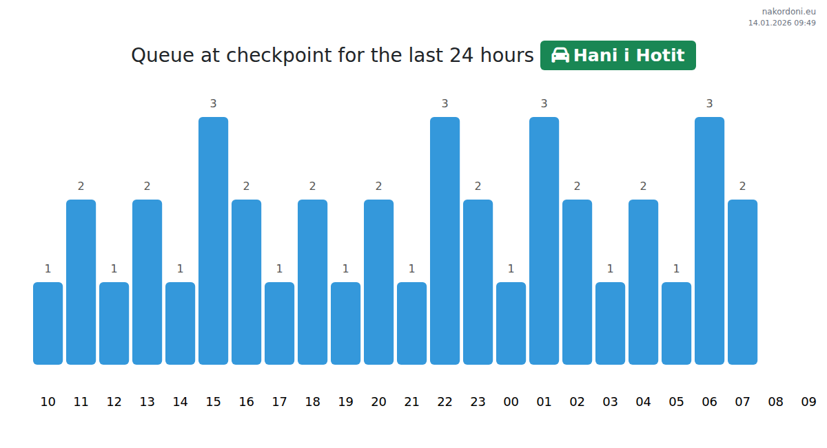 Plan your trips in advance using up-to-date border queue information at the Hani i Hotit - passenger car checkpoint to make your crossing fast and convenient. Pay special attention to these hours to avoid peak times and reduce waiting times.