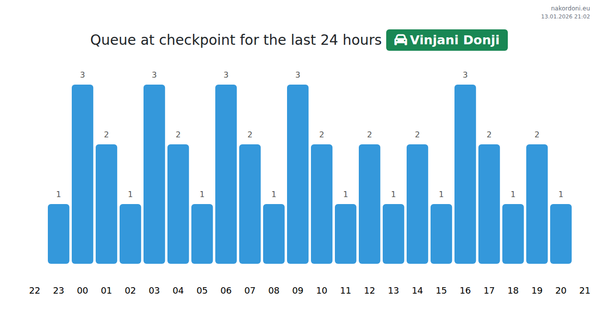 To avoid long queues at the Vinjani Donji - passenger car checkpoint, it is recommended to plan your border crossing during the least busy hours. According to the data from the past day, the lowest number of vehicles was observed between :00 and 3:00 hours. This is the ideal time to cross the border, saving time and avoiding delays.