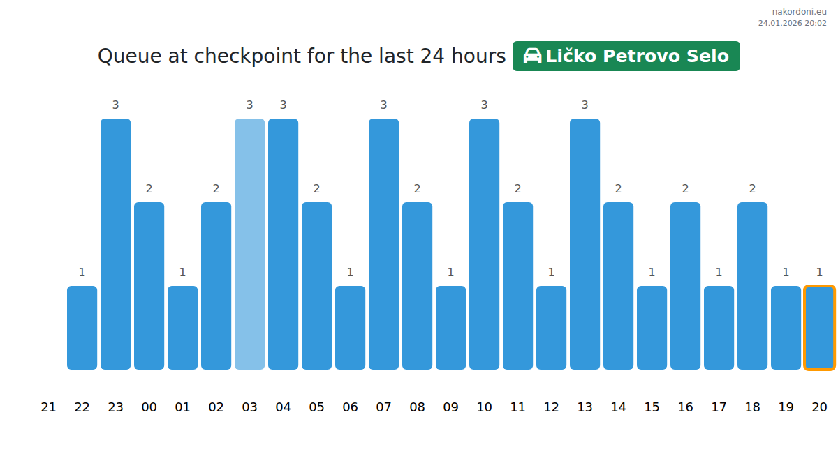 To avoid long queues at the Ličko Petrovo Selo - passenger car checkpoint, it is recommended to plan your border crossing during the least busy hours. According to the data from the past day, the lowest number of vehicles was observed between 2:00 and 5:00 hours. This is the ideal time to cross the border, saving time and avoiding delays.