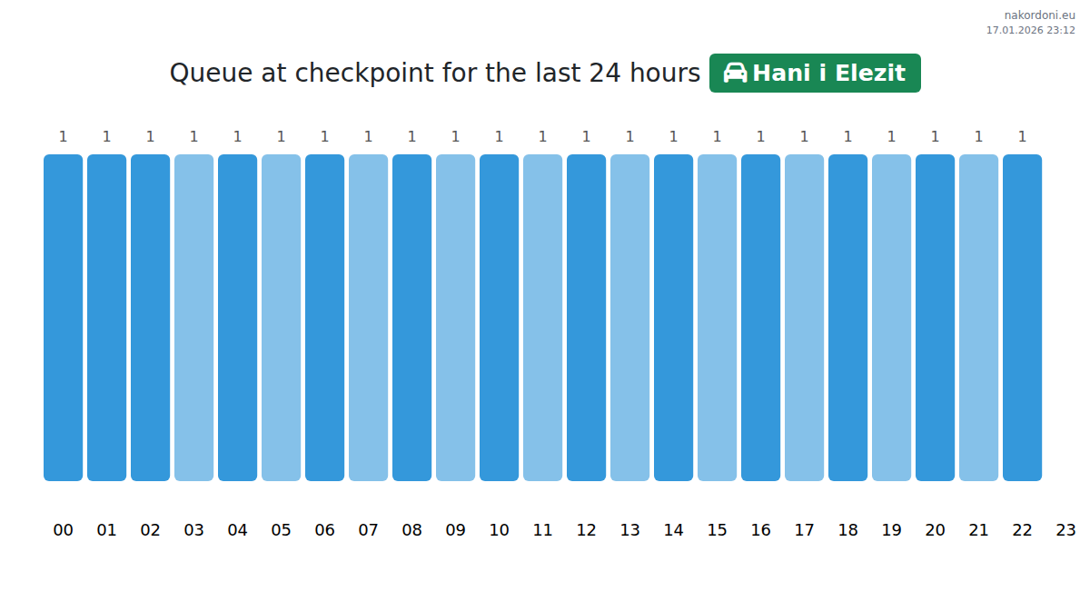 To avoid long queues at the Hani i Elezit - passenger car checkpoint, it is recommended to plan your border crossing during the least busy hours. According to the data from the past day, the lowest number of vehicles was observed between :00 and 2:00 hours. This is the ideal time to cross the border, saving time and avoiding delays.