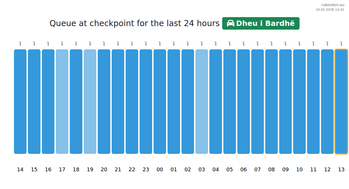 To avoid long queues at the Dheu i Bardhë - passenger car checkpoint, it is recommended to plan your border crossing during the least busy hours. According to the data from the past day, the lowest number of vehicles was observed between :00 and 2:00 hours. This is the ideal time to cross the border, saving time and avoiding delays.