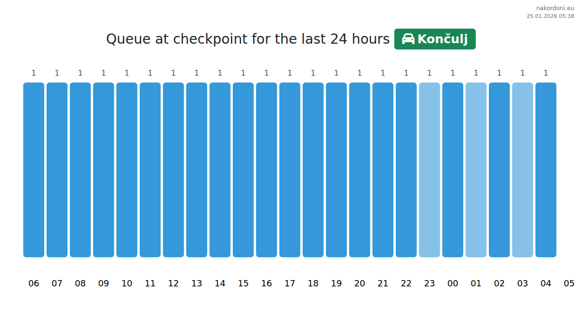 To avoid long queues at the Končulj - passenger car checkpoint, it is recommended to plan your border crossing during the least busy hours. According to the data from the past day, the lowest number of vehicles was observed between :00 and 2:00 hours. This is the ideal time to cross the border, saving time and avoiding delays.