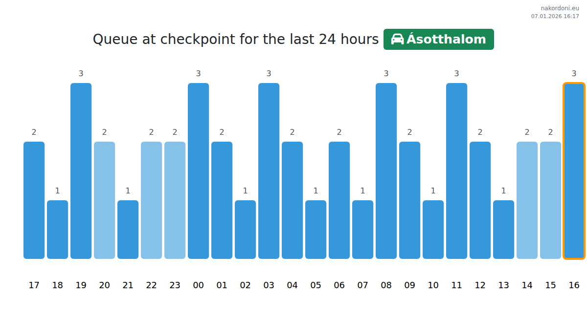 Plan your trips in advance using up-to-date border queue information at the Ásotthalom - passenger car checkpoint to make your crossing fast and convenient. Pay special attention to these hours to avoid peak times and reduce waiting times.