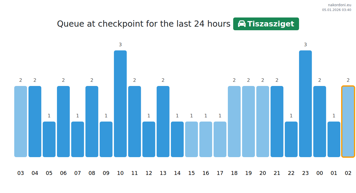 Plan your trips in advance using up-to-date border queue information at the Tiszasziget - passenger car checkpoint to make your crossing fast and convenient. Pay special attention to these hours to avoid peak times and reduce waiting times.