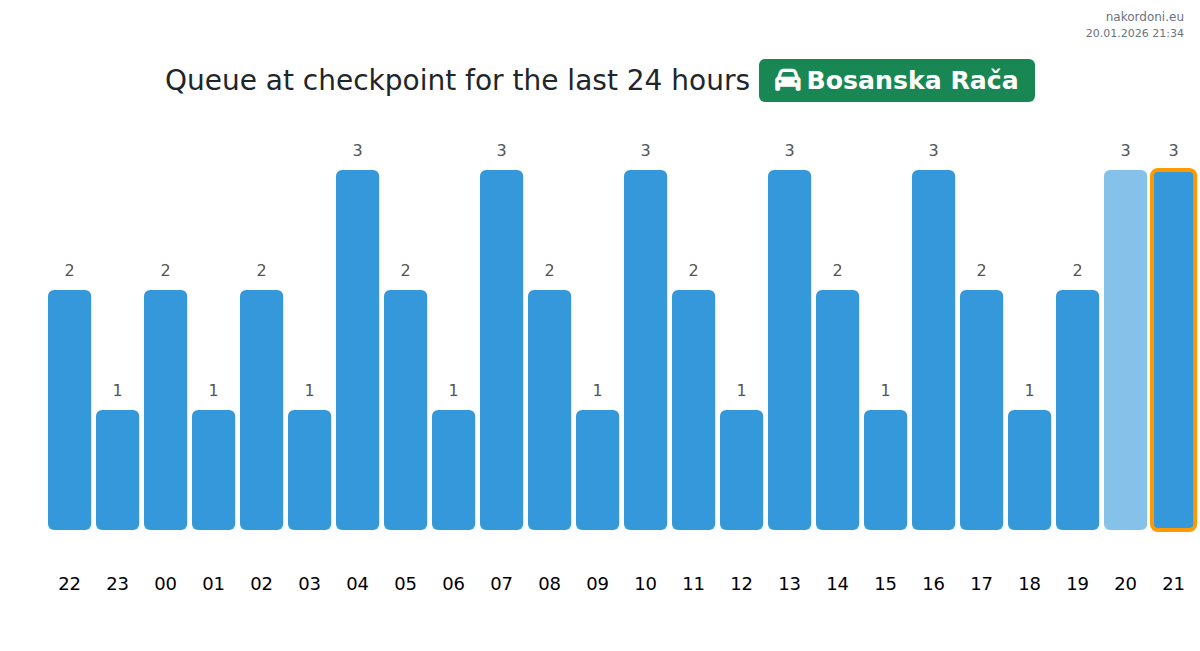 At the Bosanska Rača checkpoint, wait times for cars range from 20-55 minutes. To save time, avoid peak hours at 10:00, 12:00, and 14:00. The best times to cross are 01:00, 03:00, or 04:00.