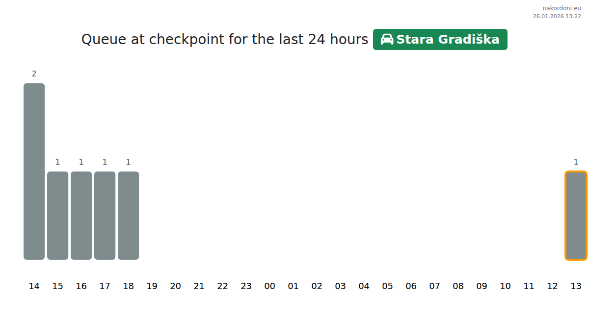 At Stara Gradiška, wait times for cars range from 71-83 minutes. Peak congestion is expected at 10:00, 13:00, and 14:00. For a faster crossing, aim for 01:00, 02:00, or 03:00 when queues are shortest.